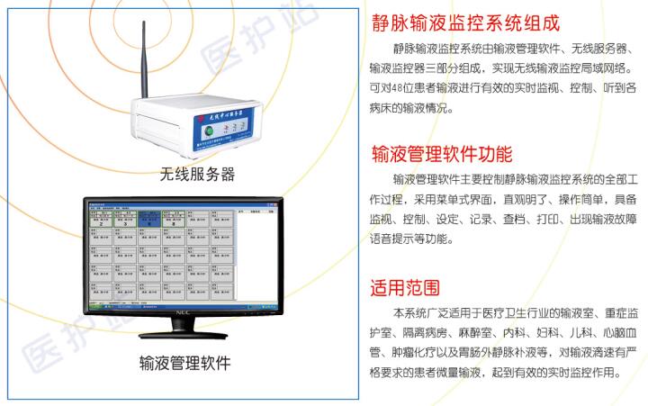 適用范圍: 本系統(tǒng)廣泛適用于醫(yī)療衛(wèi)生行業(yè)的輸液室、重癥監(jiān)護(hù)室、隔離病房、麻醉室、內(nèi)科、婦科、兒科、心腦血管、腫瘤化療以及胃腸外靜脈補(bǔ)液等,對(duì)輸液速度有嚴(yán)格要求的患者,起到有效的實(shí)時(shí)監(jiān)視控制作用。
